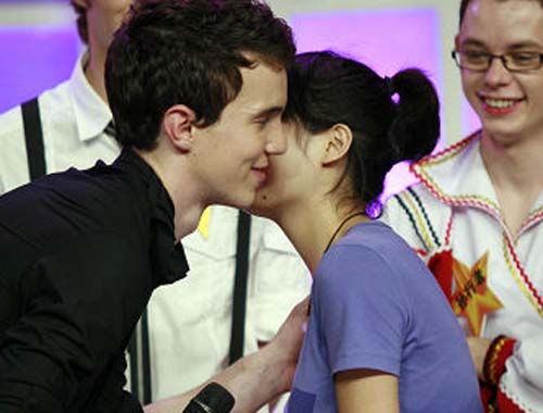 俊朗的潇如风和女观众行法式见面礼