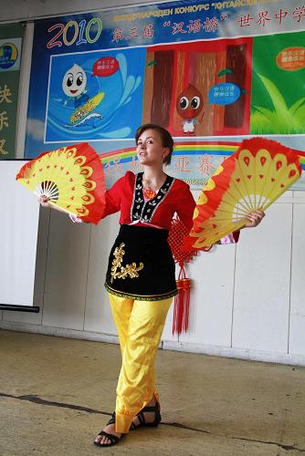 6月17日,参赛选手芳萌在保加利亚首都索菲亚举办的第三届“汉语桥”世界中学生中文比赛保加利亚赛区预赛中进行才艺表演。当日,第三届“汉语桥”世界中学生中文比赛保加利亚赛区预赛在索非亚举行。新华社记者王蒙摄
