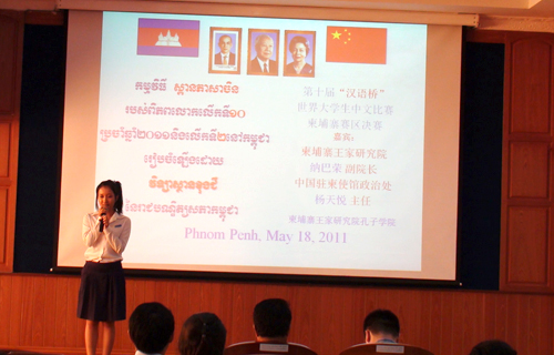 2011年5月18日下午,第十届“汉语桥”世界大学生中文比赛柬埔寨赛区决赛在柬埔寨王家研究院孔子学院隆重举行。这也是柬埔寨首届“汉语桥”大学生中文比赛。柬埔寨王家研究院纳巴荣(NETH BAROM)副院长、中国驻柬埔寨大使馆政治处杨天悦主任、使馆一等秘书盛蔚蔚女士、孔子学院全体教师和部分学员共一百余人观看了比赛。