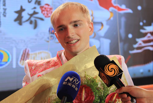 董鹏德:期待啊,呵呵。因为我是学中文,所以肯定是喜欢中国,而且来参加这个汉语比赛就让我更进一步地了解并喜欢中国文化和语言。九月份我就要开始学我一直特别喜欢的古典文学,我已经很期待了。
