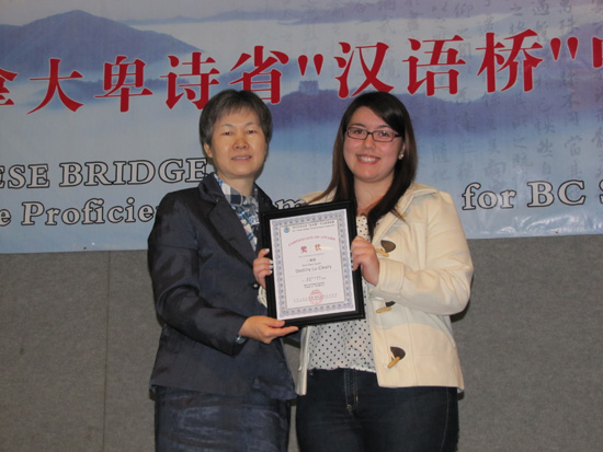 中国驻温哥华总领事刘菲颁奖 - 母语非汉语组11-12级冠军Destiny Lu-Cleary