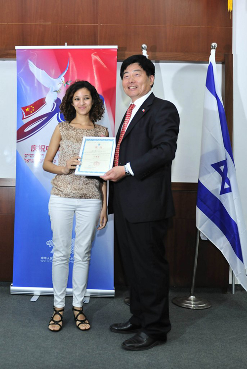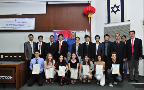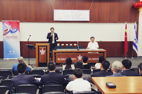 由中国驻以色列大使馆教育组和特拉维夫大学合作承办的第十一届“汉语桥”世界大学生中文比赛以色列赛区预赛在特拉维夫大学落下帷幕,高燕平大使出席颁奖仪式并致辞。来自以色列各大学的选手,选手的家长和拉拉队,以色列大学生,部分中国留学人员代表和中外媒体记者等150多人观看了比赛。驻以色列使馆首席馆员施泳参赞,教育处、办公室、文化处、商务处等有关部门负责人出席了这次中文比赛。