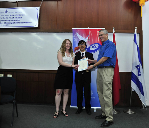 经过评委的认真评议,第十一届“汉语桥”世界大学生中文比赛以色列赛区预赛评出一等奖、二等奖各2名,三等奖3名。来自特拉维夫大学杰克(Mr. Shahaf)和艾苇婷(Ms. Avital)同学以流利的中文演讲和精彩艺术展示同获冠军。他们将代表以色列大学生赴中国参加第十一届“汉语桥”世界大学生中文比赛复赛及决赛。二等奖被来自希伯来大学和海法大学选手获得。