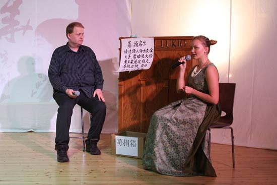 开心之后,来自图尔库大学的Virpi Kamppuri 做了名为《中国流行音乐》的演讲,以富有条理性的语言阐述了自己对中国流行音乐的看法,并在之后的节目表演中演唱了中文歌曲《大海啊,故乡》更是赢得满堂彩。来自Turun Iltalukio的Isa Kujansuu也做了名为《芬兰是一个双语国家》的演讲,用准确的语言介绍了芬兰作为一个双语国家的特点和现状。接下来,Ebenezer Owusu-Afriyie的表演又一次让观众们笑得前仰后合。这位来自于韦斯屈莱大学的小伙子,以幽默诙谐的故事串联成一段精彩绝伦的汉语脱口秀。正当观众们为表演者趣味十足的演出议论纷纷的时候,更多的精彩演讲和表演也逐一上场。在赫尔辛基大学的Niina Pitkäranta讲述了她住在中国的有趣经历之后,从奥卢大学远道而来的Henrik Hako Rita和Sami Jutila,以演讲与演唱结合的新颖形式,比较了中芬两国各具特色的饮食文化。