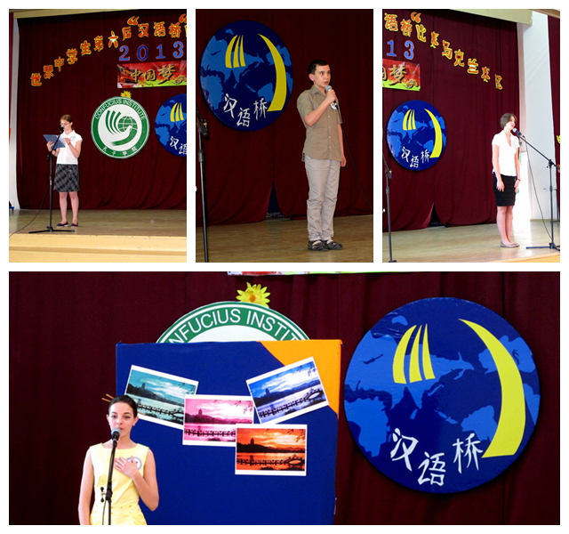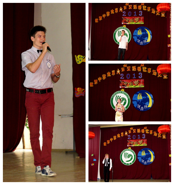 在主题演讲环节中,选手们绘声绘色、热情洋溢地讲述着自己与汉语和中国文化的情缘,畅想着自己未来的中国梦想。达尼尔因为在午睡中的爸爸的脸上完成了自己的京剧脸谱“杰作”而真正的踏上了学习汉语的道路;出生在美国纽约、成长在乌克兰基辅的伊万申科•奥莉雅心中一直有个梦想--能够踏上中国的土地,感受来自遥远东方、文明古国的魅力气息;阿列娜受到已在中国工作的姐姐的鼓励和支持开始学习汉语,并希望以后能像姐姐一样,为中乌两国人民友谊和文化交流做出贡献;高大的维克多则希望能够学好中文,以后能跟心中的篮球偶像姚明切磋球技。流利清晰的汉语表达征服了在场的每一位观众。