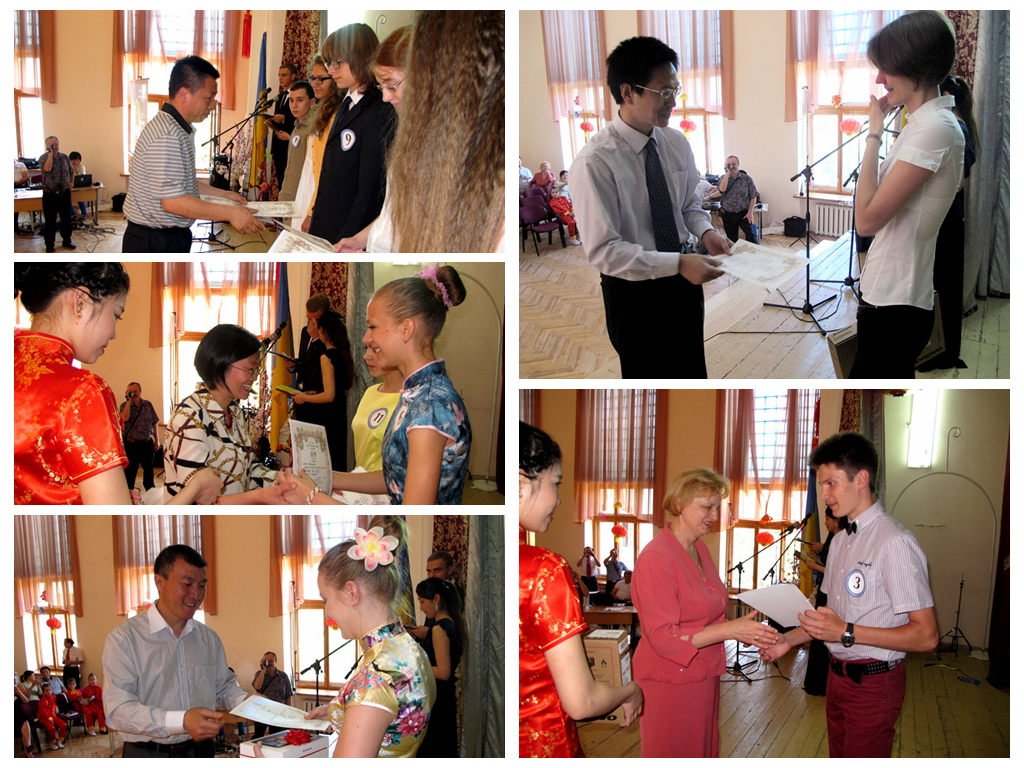 最终,来自基辅第一东方语言学校的朱拉伊•阿列娜获得了本届比赛的冠军,亚军和季军同样由来自该校的罗博达•达尼尔和娜乌缅科•奥莉雅获得。中国驻乌克兰大使馆教育处负责人汪金国同志、基辅第一东方语言学校校长韦尔比茨卡女士、基辅国立大学孔子学院孙克文院长和卢甘斯克大学孔子学院李姬花院长分别为获奖者颁奖。