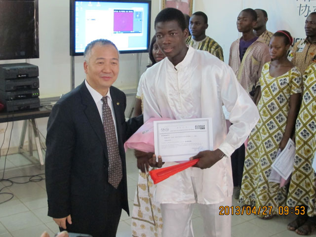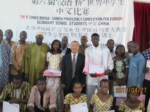 2013年4月27日上午,第六届“汉语桥”世界中学生中文比赛马里赛区预选赛在首都巴马科阿斯基亚中学孔子课堂隆重举行!马里汉语教学点所在各中学选拔推荐的11名选手,经过演讲、问答和才艺展示三个环节的激烈角逐,阿斯基亚中学的阿里 巴罗和锡卡索国立第一中学的萨利马达.桑嘎勒两位同学获得了一等奖,其他同学获得了二等奖。中国驻马里大使代办郭学立、马里国家教育部门等领导为获奖选手颁了奖。