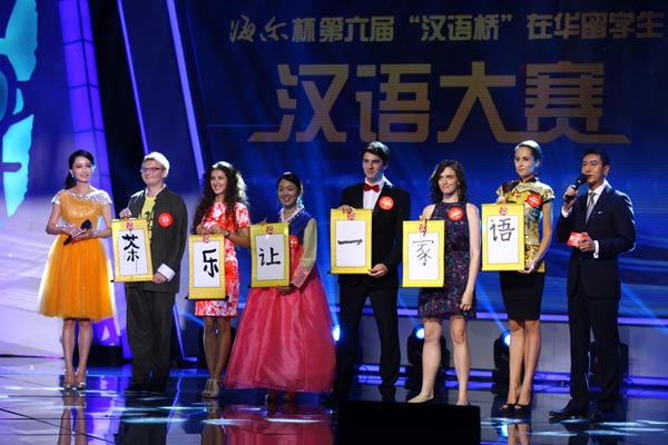 比赛开始后的第一个环节依旧是大家熟悉的“最爱中国字”,选手需要用毛笔写下一个汉字,并用一分钟时间阐述其原因,此环节是为了考察选手对中国汉字的领悟力。经过前面三天的比赛,今天的参赛选手吸取了前面选手的经验,无论是在所写汉字的字形上,还是在一分钟的阐述环节,都表现得更为出色。在俄罗斯推广茶文化的李安,身穿中山装,写下了一个“茶”字,讲述自己想成为“俄罗斯陆羽”的中国梦;美国大妞欧阳若兰用一个“家”字,表达了对远在万里之外的姐姐和妈妈的思念。来自英国的帅小伙马佳睦在这个环节表现得最为出色,他写下的是一个最简单的“一”字,却用一连串含有“一”的成语阐述自己想拿第一的决心,从容淡定和口齿伶俐的他,获得了大众评审团的亲睐,拿到了本环节的最高分。