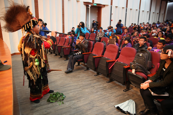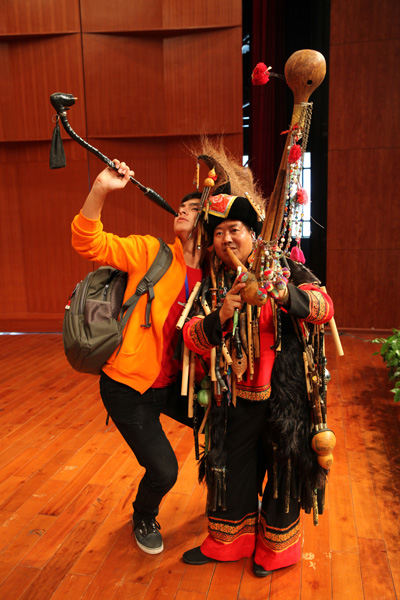 值得关注的是,一位身着少数名族服饰的“民间艺术家”为大家带来的精彩民间乐器表演。在他的手里树叶、烟斗、盒子都变成了精美的乐器。他用这些日常用品演奏出了一曲曲动人的旋律,深得选手们喜爱。演出后,选手们纷纷走上台前来争相与艺术家合影留念。下午,选手们将迎来第四场比赛“绽放彩云南”创意插花比赛。
