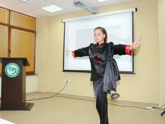 此次比赛二等奖获得者,来自大特大学的姚晓惠同学在才艺表演中表演太极拳