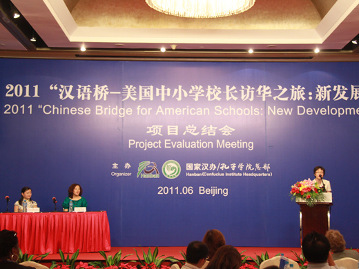 6月25日“汉语桥—美国中小学校长访华之旅:新发展”项目总结会在北京举行。国家汉办工作人员朱丹、周之畅、李铭思、李晖分别向美国校长们介绍了汉办教材、志愿者教师、孔子课堂、网络孔子学院等项目和资源,美方赴各地参观考察组代表交流了几天来的活动感受,最后重大项目与交流处陈默处长致辞并宣布活动圆满结束。