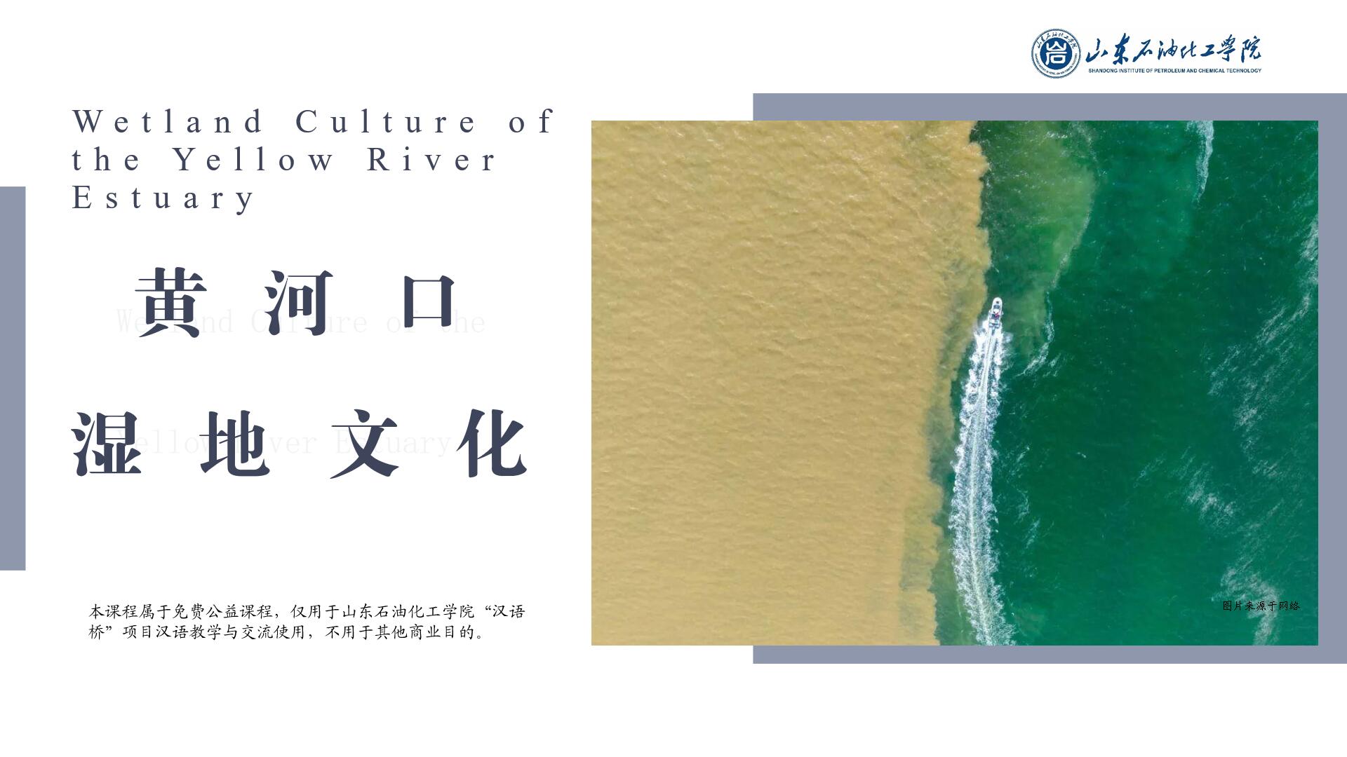 《黄河口湿地文化》:黄河与大海的撞击,积淀成了神奇的黄河三角洲,造就了美丽富饶的黄河口湿地。黄河携沙填海,使这片土地如今还在不断地向着大海的方向生长,是我国乃至世界大河中海陆变迁最活跃、面积增长速度最快的三角洲,被誉为“共和国最年轻的土地”,是世界上最新鲜的土地。本课程从滋润中华文明、泽养生命万物、回归诗意栖居三个部分,带领同学们一起走进黄河口湿地,探寻湿地文化,欣赏河海交汇、芦花飞雪、长河落日、碱蓬红毯、万鸟翔集、油区风光的美景,感受人与自然诗意的栖居。