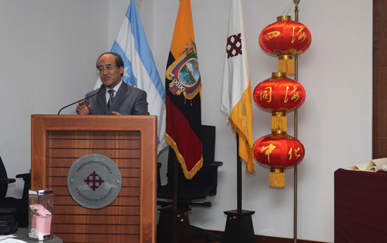 厄瓜多尔共和国当地时间5月31日上午9点,瓜亚基尔天主教大学主楼礼堂里洋溢着浓郁的中国文化气息。厄瓜多尔首届“汉语桥”大学生中文比赛暨第十二届“汉语桥”世界大学生中文比赛厄瓜多尔预赛在此隆重举行。 中国驻瓜亚基尔总领馆王卫华总领事、闫秀玲领事、瓜亚斯省政府代表雷德斯曼、瓜亚基尔大学校长CEDENO 博士,天主教大学副校长CECILIA 博士,卡萨戈兰德大学管理与政治学系主任科雷亚等嘉宾以及从全国各大学和孔子学院预选赛中脱颖而出的25名优秀大学生选手、家长共计120多人出席了本次比赛。
