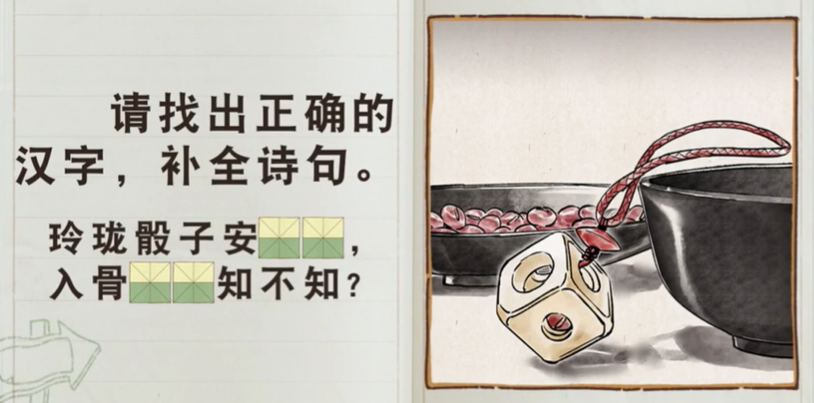 请找出正确的汉字,补全诗句。 玲珑骰子安()(), 入骨()()知不知。 红、枣、果、花、豆、思、相、椒、念