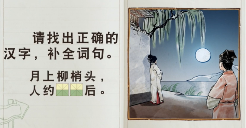 请找出正确的汉字,补全词句。 月上柳梢头, 人约()()后。 黄、晚、昏、傍、凌、清、半、夜、晨