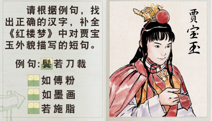请根据例句,找出正确的汉字,补全《红楼梦》中对贾宝玉外貌描写的短句。例句:(鬓)若刀裁,()如傅粉,()如墨画,()若施脂 耳、发、鼻、唇、齿、眉、面、指、睫