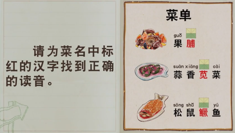 果脯guǒ () 蒜香苋菜suàn xiāng () cài 松鼠鳜鱼song shǔ () yú pǔ pú fǔ jiàn xiàn hàn jué guì qué