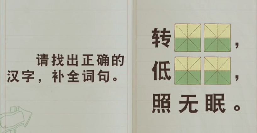 请找出正确的汉字,补全词句。 转()() 低()() 照无眠。 头、绮、朱、倚、户、楼、思、阁、月