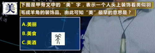 下图是甲骨文中的“美”字,表示一个人头上装饰着类似羽毛或羊角的装饰品。由此可知“美”最早的意思是?