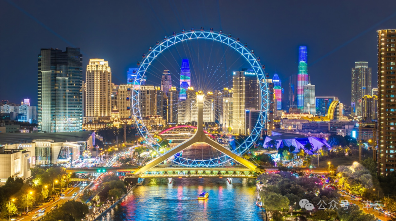 永乐桥上的 “天津之眼” 是亚洲仅有的建在桥上的摩天轮。每当夜幕降临,灯光与海河交相辉映,形成了( )的景观。